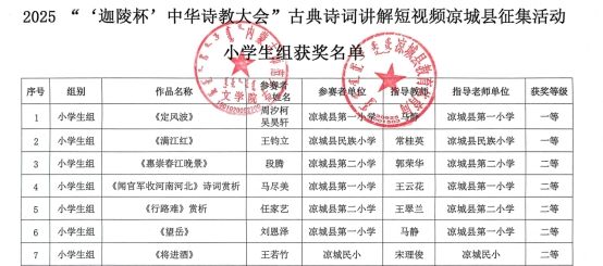 本次古典诗词讲解短视频征集活动分为小学生组、中学生组、教师组三个组别,经凉城县所属各中小学校初赛和遴选,最终有56件作品进入决赛。入选作品以社会主义核心价值观为引领,以铸牢中华民族共同体意识为主线,以我国古代、近现代和当代有社会影响力和典范价值的诗词作品为题材,采用作品分析、讲评、解读以及微短剧、音乐、舞蹈、国风变装、非遗表演、曲艺等多种形式演绎和阐释古典诗词的情景、韵味和精神。经专家评审,最终评出一等奖作品5件,二等奖作品14件,三等奖作品若干;同时评出优秀指导教师3人,优秀组织奖3个。