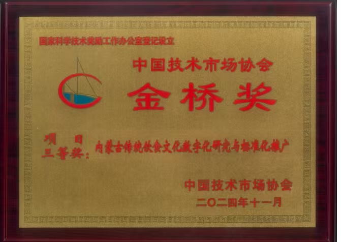 第十二届金桥奖表彰奖励大会于2024年12月12-14日在北京召开。按照《中国技术市场协会金桥奖评奖办法》规定的程序,beat365彭文明国家技能大师工作室攻关项目《内蒙古传统饮食文化数字化研究与标准化推广》荣获第十二届中国技术市场协会金桥奖项目三等奖。
